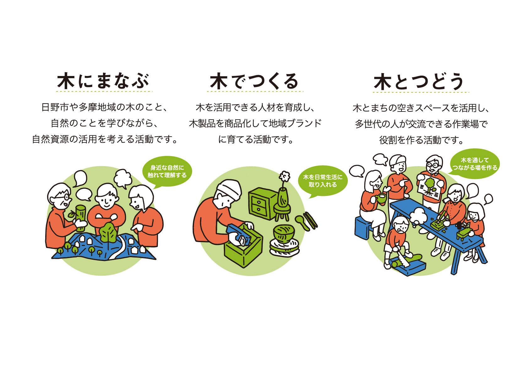 東京都日野市の材木店の空きスペースを生かして、ゆるやかに人と自然、人とまち、人と人がつながる場を作るプロジェクト「日野まちのき」。私自身も本部メンバーとなり、VIの視点でコンセプト、ロゴ、キービジュアルの制作を行いました。