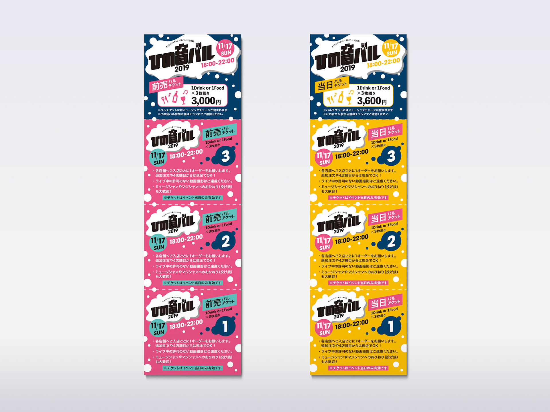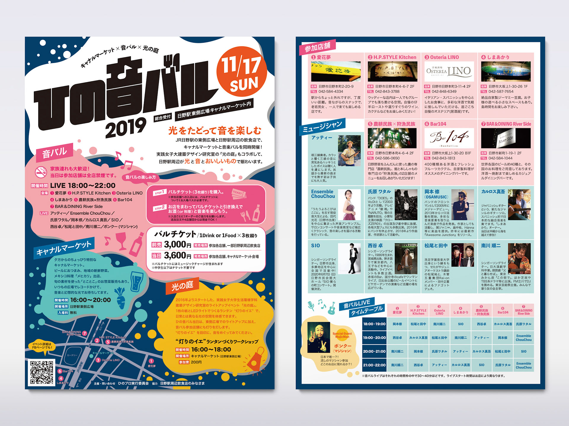 日野駅周辺の飲食店で行われる、音楽と色と光のオブジェのイベント「ひの音バル」。ロゴとグラフィックを制作しました。ファミリー層にもフレンドリーな企画なので、明るい色使いと、ポップな楽しさ溢れるデザインにしました。