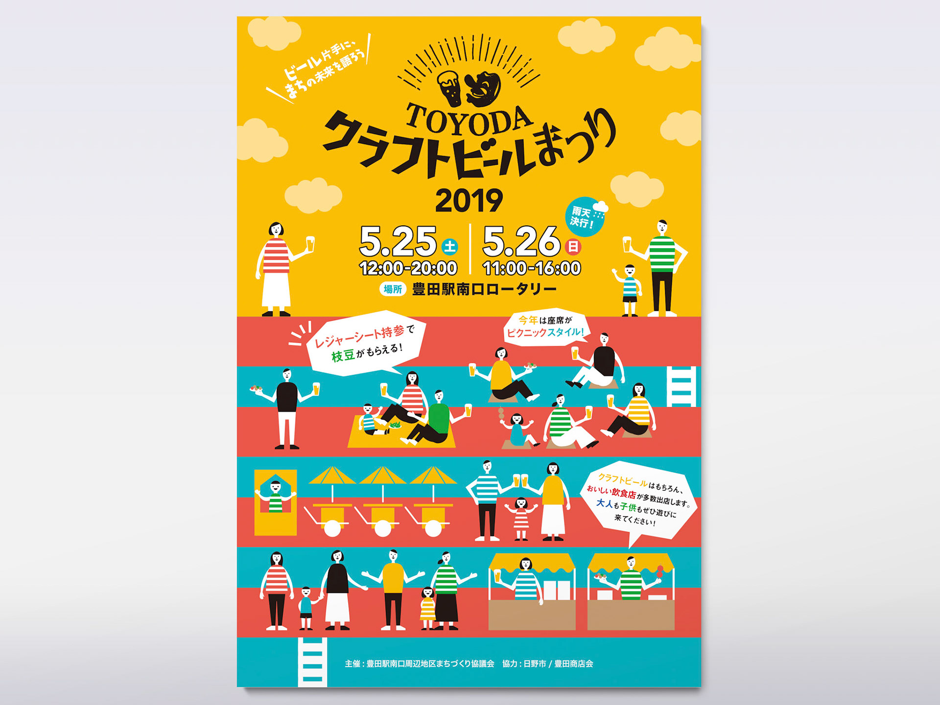 JR豊田駅南口で開催される「TOYODAクラフトビールまつり」の、ロゴ、ポスター、バナーのデザインを一貫して制作しています。クラフトビールファンはもちろん、何よりも地元の人々の交流の場になってほしいとの想いを形にしたお祭りです。 新しくできた駅前大通りの賑わいをイメージし、ストリートをボーダー柄に見立てました。
